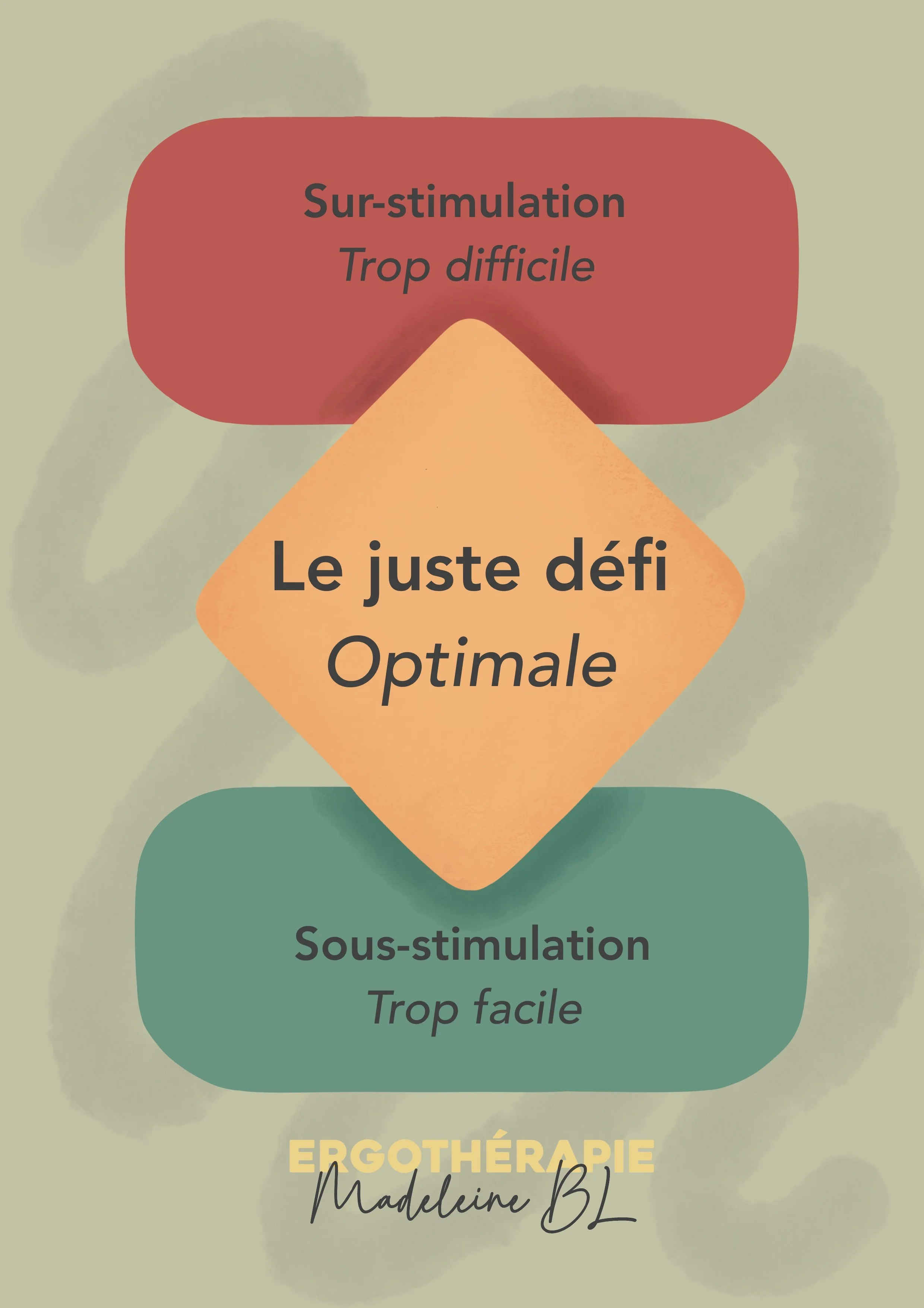 En ergothérapie, on cherche souvent à aider la personne à retrouver du sens et du plaisir dans ce qu’elle fait au quotidien. Que ce soit au travail, à la maison ou dans les loisirs, tout est une question d’équilibre : trouver une activité qui n’est ni trop facile ni trop difficile. C’est ce qu’on appelle le juste défi.